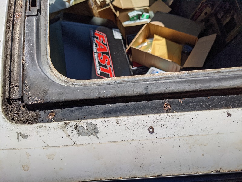 The sunroof was removed. Look at all that dirt! And that dried out seal! The drain holes were there. Thankfully.