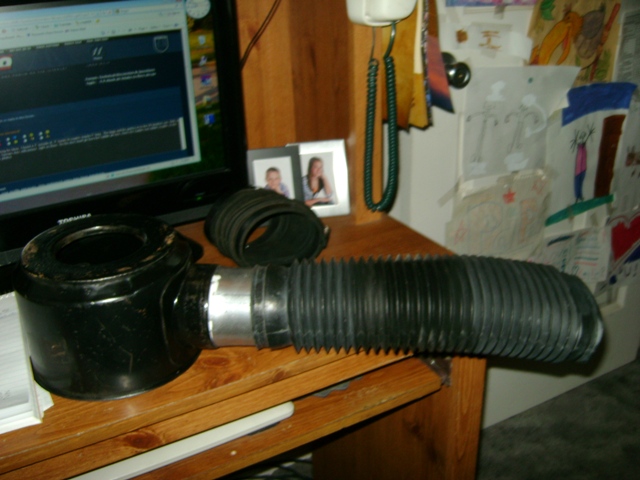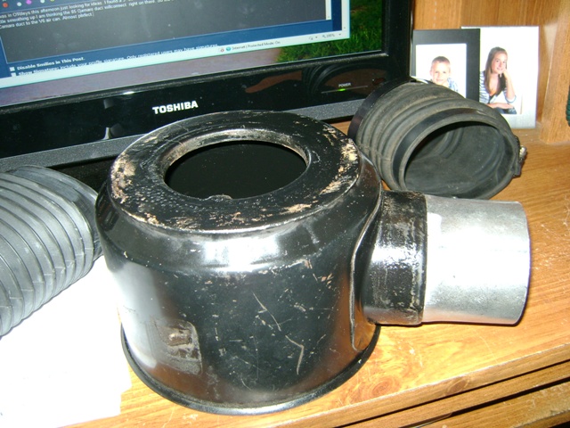 I was in O'Rileys this afternoon just looking for ideas. I found a 3" outside id, 3" inside id coupler maybe 5" long.. $3.00. The large end fits perfect in to the V6 breather can. With a little smoothing up I am thinking the 85 Camaro duct will connect on the small end. So the duct would go from the Caddie air horn, threw the Caddie oval rubber coupler, to the Camaro duct to the V6 air can. Almost perfect. Caddie Oval to the Camaro duct: