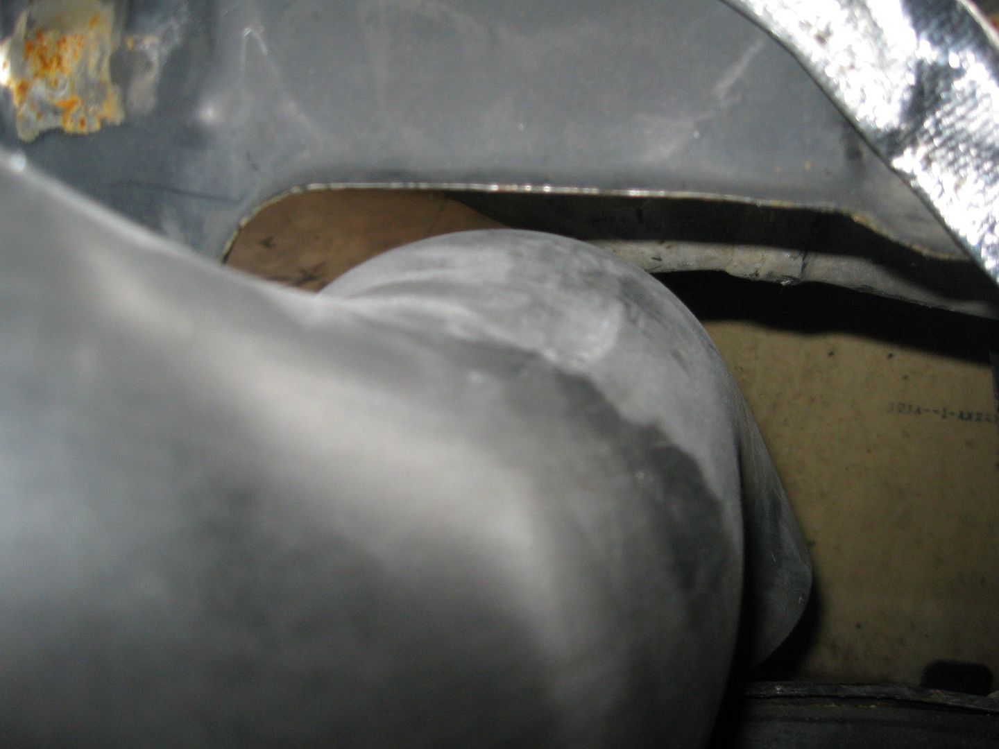 I sanded down the air intake tube for the coating in truck bed liner, but before coating it I needed to tweak the oem hole I am using for it. The intake is very tight with the factory hole and if I don't do something it will scratch when I reassemble it (and it is rather difficult to remove)... so here is how it fits the stock hole (notice it clears the frame rail, but sits on the sheet metal for the hole):