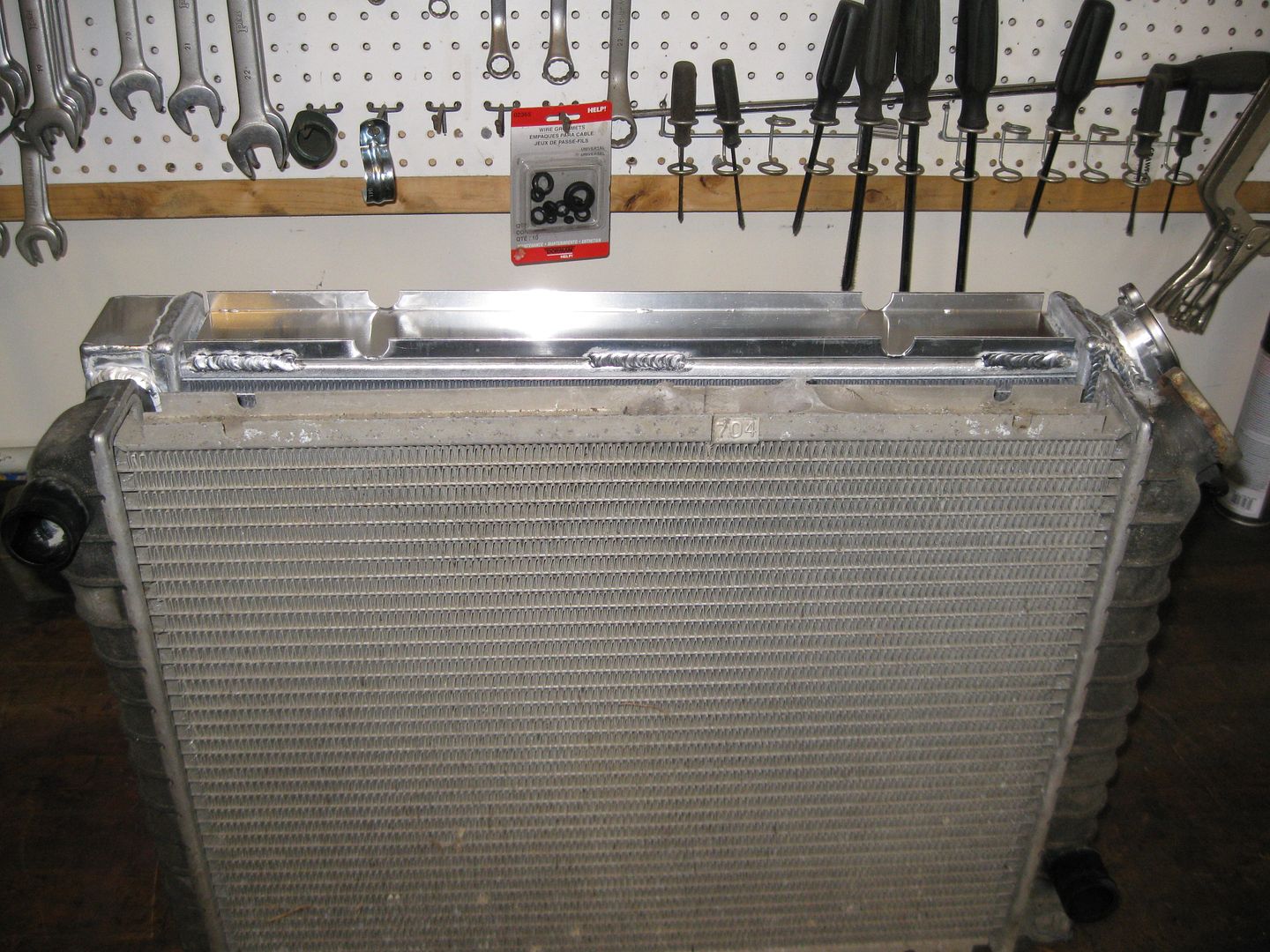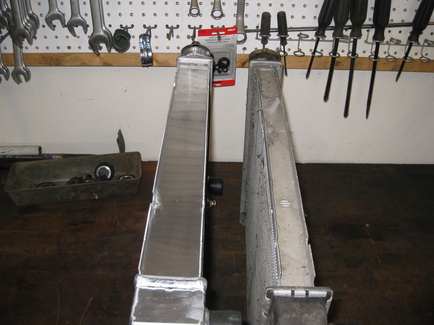 Then I moved on the the radiator upgrade. Here is the Champion one on the left and the stock V6 radiator on the right:
