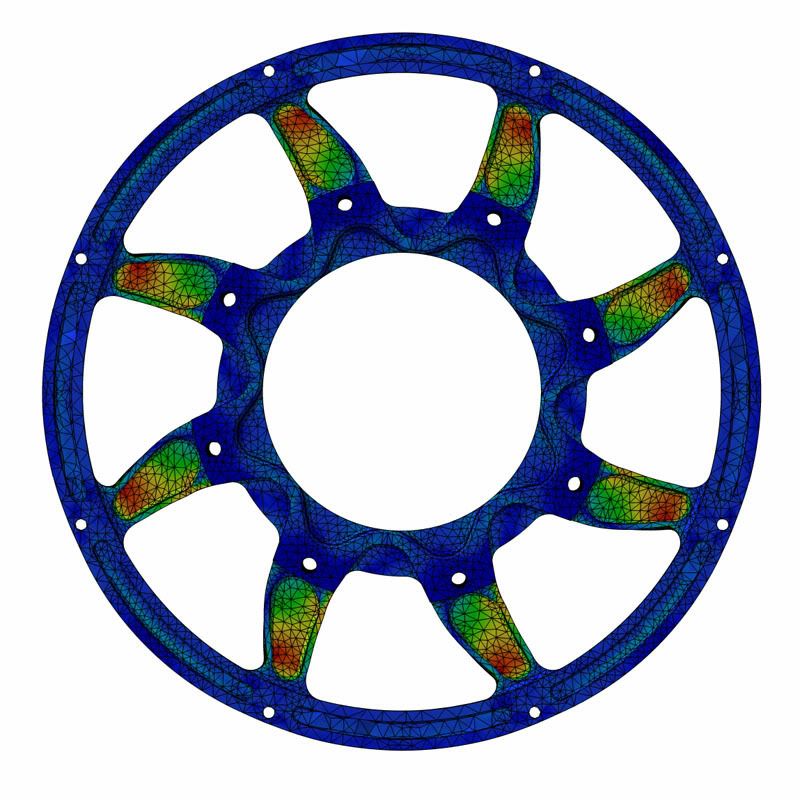 CATIA actually. Most of the analysis I've done in CATIA as well, which uses a fairly fully-featured ABAQUS solver. Some analysis I've done with ANSYS and PATRAN/NASTRAN. Most of the pretty pictures I post here are from CATIA. Here's a screenshot from the flywheel stuff I was working on last year. Last year? Scratch that, 2011. WOW. Okay: