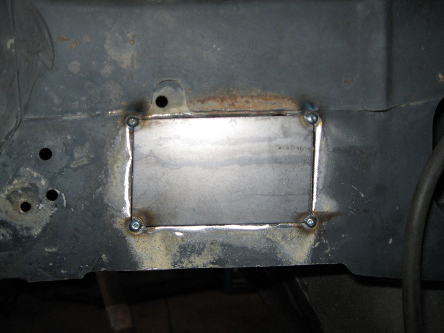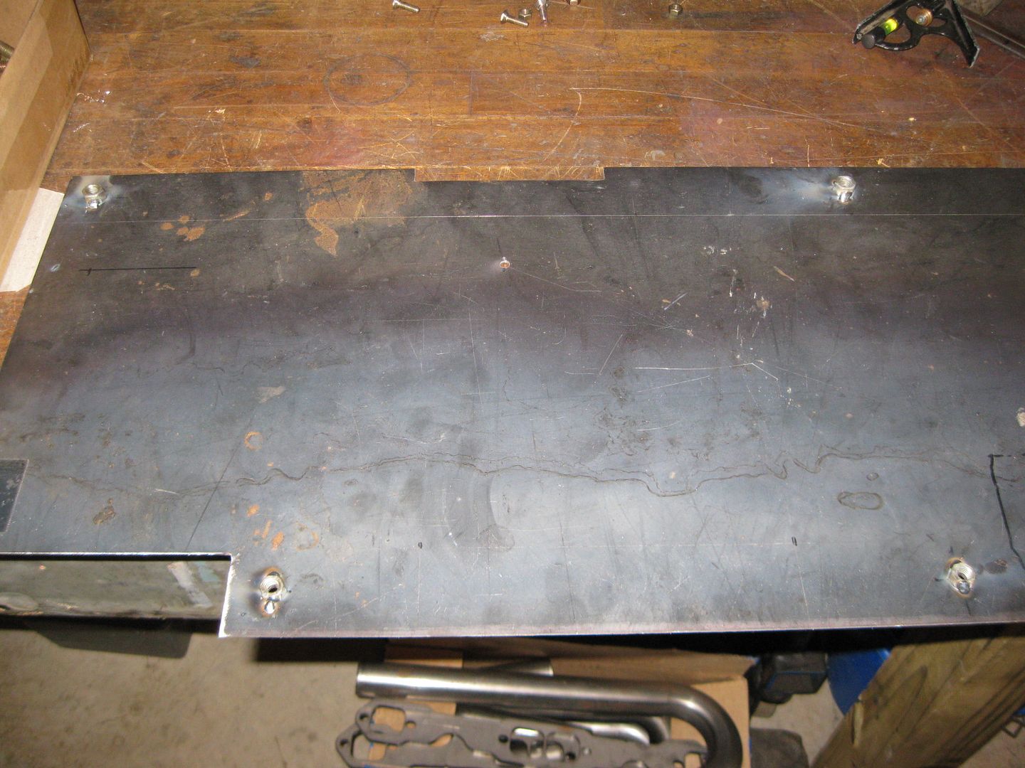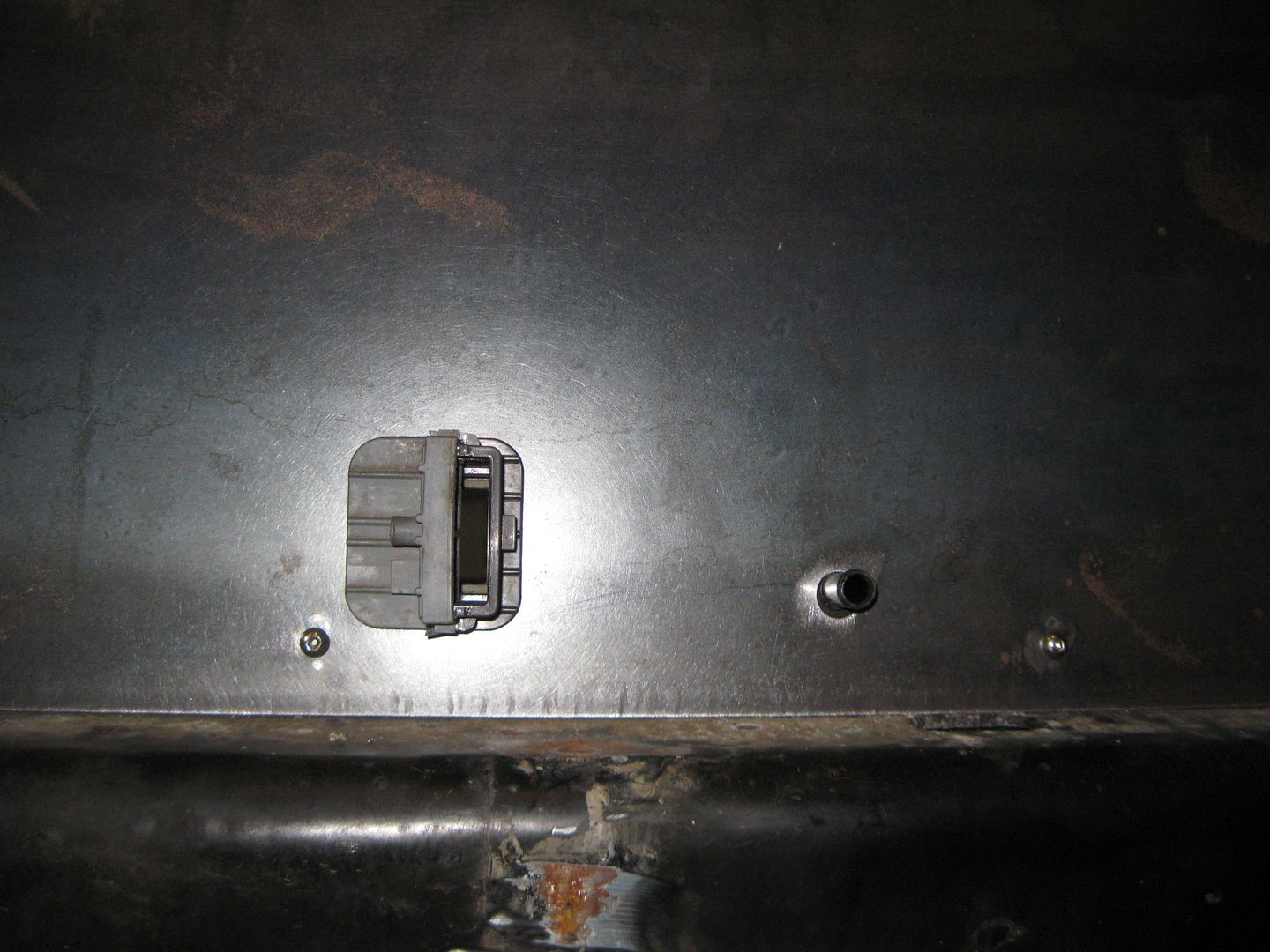 Then I started playing with the smooth firewall panel. I tacked some 3/8" nuts to the backside to space it from the stock firewall, then drilled the 1/4" mounting holes for the bolts and cut the hole for the harness connector:
