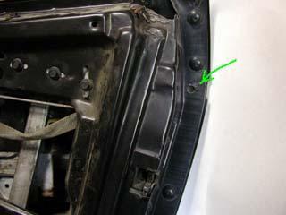 Today is a rerun of yesterday in the IMSA garage, with the exception that it's happening on the opposite side of the car, so I'll throw this in instead. The door trim is easily removed, with the exception of the little piece behind the door handle. that one piece is retained by a single screw that goes in from the back side of the door skin. To get to it you can remove the door skin........ or simply drill a small hole (note green arrow) in the door to access the phillips head screw.[This message has been edited by Russ544 (edited 07-08-2009).]