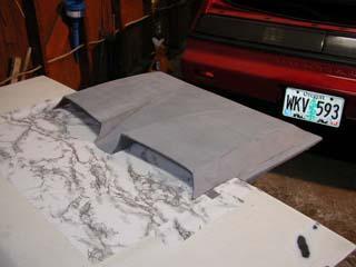 The rear decklid vents/wing stands you made are defiantly unusual. I like it ! I would have never thought of doing it that way but I imagine it works quite well by getting the vents back far enough to get back into the airflow where they can create some vacuum. I do already have a plan for mine however. In fact you may find that by the time I mention a specific portion of my project I've most likely been thinking about it for quite some time. I tend to do most of my "development work" in my head, with quite a bit of detail, before making any mention of it . About a year ago, when I was working on my sbc project, I built a plug and a mold for rear decklid "scoops" that would bolt onto an 84 style decklid in place of the vent section. My idea was to develop a system that any novice could just bolt on without any glass work involved. I was never totally satisfied with the shape, so it kind of got put on the back burner......... until now. I did pull one scoop from my mold and install it on my sbc project, but it still needs some reshaping to satisfy my vision of what it should look like. I don't have a decent photo of the finished and painted product but here's the raw part as it came out of the mold, sitting on an 84 decklid.