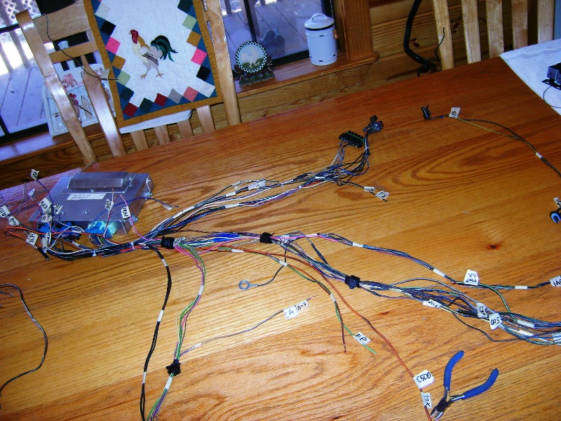 Here is a pic of my progress on my harness. I still need to blend the two relays, and the C203 in to the harness. I will attach the seven wires to the C500, into the rest of this, after it is in the car. There are 4 wires from the ECM to the transmission Park Neutral switch also. It is still attached to my C500.