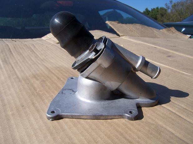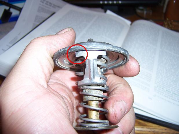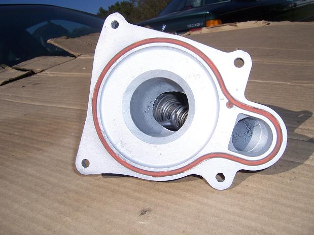 This is the inside of the T-stat housing. The center hole goes to the waterpump inlet. The waterpump pushes water into the block. The water returns from the heads to the water manifold and can go to the heater core, the radiator or back to the offset opening in this picture. -If it goes to the heater core, it comes back to the smaller uncapped connection in the picture above, goes around the thermostat and straight into the waterpump inlet. -If it goes to the radiator, it comes back to the capped connection in the picture above and is metered by the thermostat into the waterpump inlet -If it goes straight back to the thermostat housing, it goes through the recirculation valve portion of the thermostat and back into the waterpump inlet. -If the thermostat is closed, then the pressure at the offset inlet below lifts the recirculation valve (which is only spring loaded, not temp controlled) and goes back into the waterpump -If the thermostat is open, then the water coming back from the radiator can go through the T-stat to the waterpump inlet. Since there is less recirculation flow from the engine, there is less pressure holding the recirc valve open and the spring force closes it.