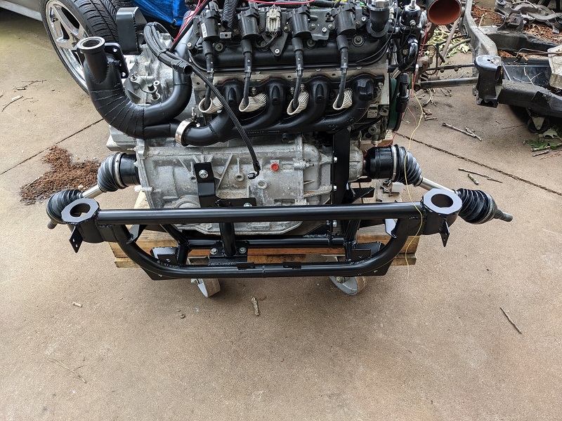 After Mike welded up the mock up axles, we then took the drive train off the cradle and split the engine from the transmission. This week Mike is planning on putting in time to get the final welding done on the cradle, and drop it off at the powder coater by Friday.