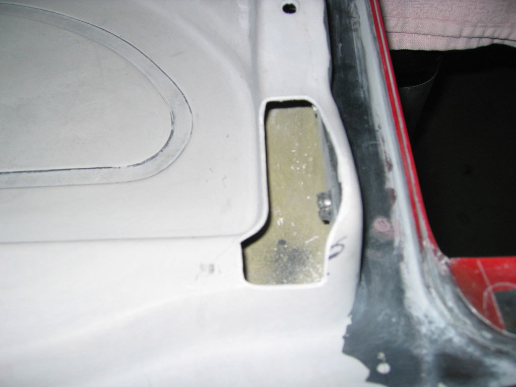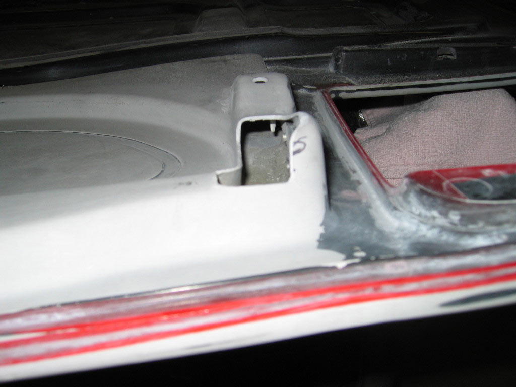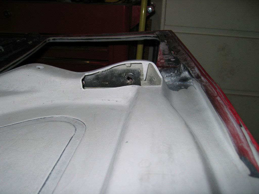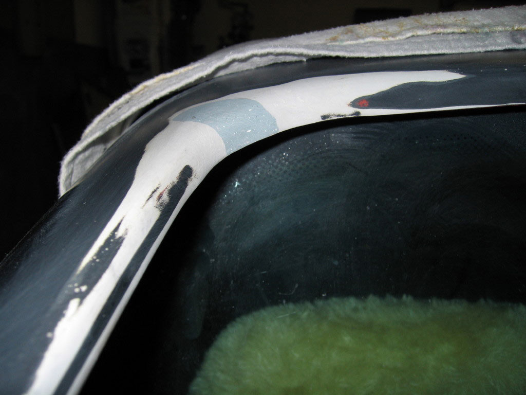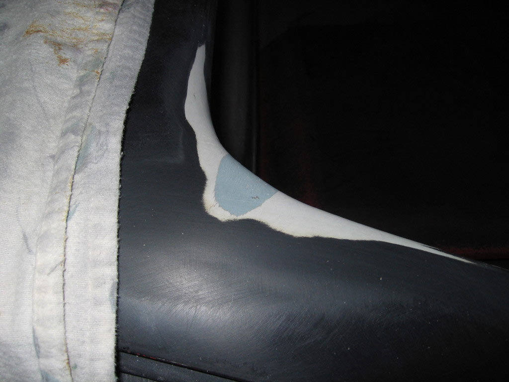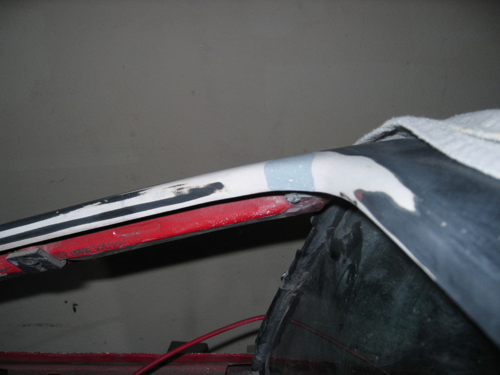 I decided to get brave and try filling in the cracked corner of my rear roof section. While I was using a half round rasp to prep the cracked area it began to look more like a factory flaw in the roof section that was filled in with something. It was crumbling away as I ground it out. I mixed up some SMC Panel Adhesive and added some chopped up fiber. After packing it into the damaged area I let it sit for about an hour. It was ready to sand down by then and as usual it took a bit longer than I thought it would but I think it came out ok. Well, hopefully ok for my first repair on this stuff...