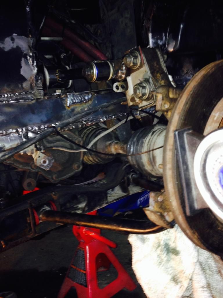 Looks like i can only make a brace for one side .If I put one on both sides , I won't be able to get the mount bolts in .One brace is adequate from what I can see any way . I think there is a little confusion about how this is supposed to work .So to go from the bottom to the top , this is the setup: RCC lower control arm with stock ball joint Stock spindle No toe link arm Custom built upper arm mount welded to the cut off bottom of the original strut assembly and bolted to the stock spindle with stock mounting bolts Custom built upper control arms with delrin inner and outer bushings. QA1 coilovers pivot mounted top and bottom.I have not quite figured out how I am going to mount the coilovers yet , but I have a rough idea that will work I hope .As you can see by the picture , I have more welding and some clean up grinding to do .I just ran out of propane so that is why I am posting instead of working .My garage is not insulated so I use a propane heater to stop from freezing out there .The garage is well ventilated , so the fumes are not a problem .The picture shows the bumpsteer arm attached to the arm mount .I just use it as a "holder" while I weld .[This message has been edited by wftb (edited 01-25-2015).]