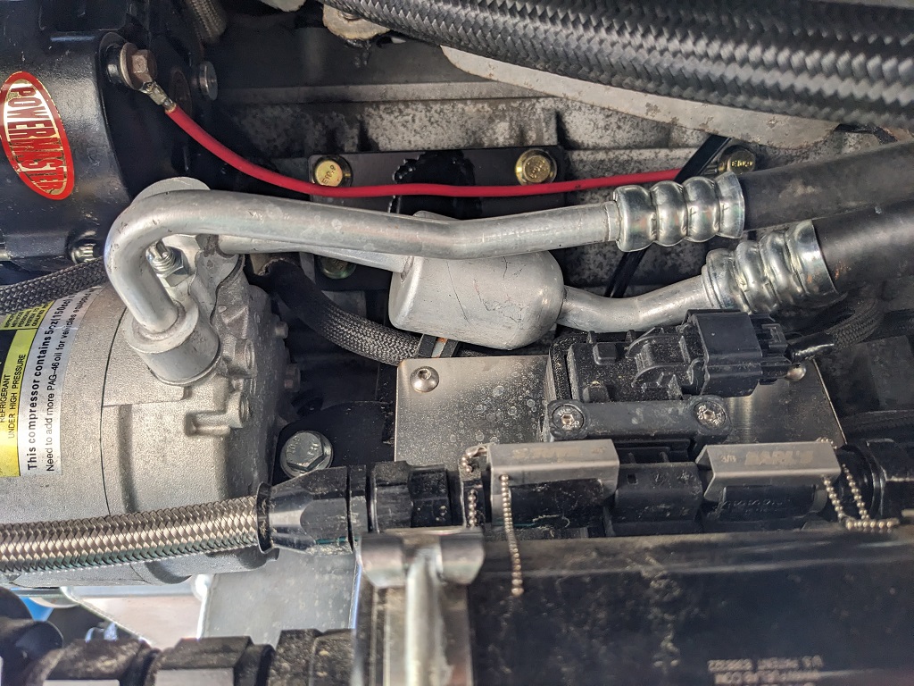 A few weeks back we got ready to drop the cradle out. I took the opportunity to see if my modified A/C hose was going to work... not quite. The hose shop that had done it for me originally had the hoses twisted up, and when I asked them to fix it, they did it by cutting the big hose in the middle, then using the grommet things to stitch it back together. That section 'crimps' the hose after I route it now, and the smaller hose is a few inches short. I'm also not a fan of how close the bend comes back in towards the engine/fuel assembly on the compressor side. Here's a pic of that.