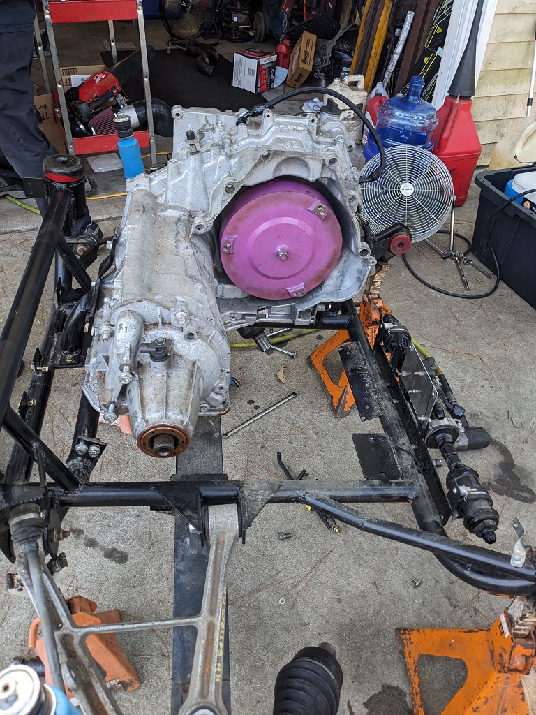 If it's just the Pressure Control Solenoid, that is on the 'upper' valve body, which with the design of Mike's cradle, we can get to by just removing up the removable frame rail on that side (and 'just' also means unhooking the control arm, brakes on that side, etc... still easier than taking everything back out). Still need to drain the fluid and such, but still a much easier part to replace.