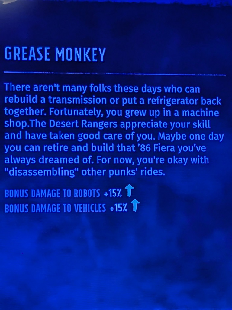 As a ha-ha for the day, a few weeks ago I was playing Wasteland 3, and one of the quirks for your character is called Grease Monkey. Part of it says "Maybe one day you can retire and build that '86 Fiera you've always dreamed of." lol They likely couldn't use Fiero because of copyrights. The text is also really blue in the picture because apparently my TV is not calibrated right. It looks correct to the naked eye, but when taking a picture with my phone, it's like I have a blue filter over my screen.