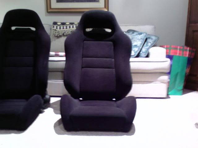 Here are some pictures of the seats I picked up. If you notice, the stiching pattern on them are slightly different. They only had one of the new style, and one of the old style in stock at different times. I picked up the old style first, used it to plan the installation, and had it as my driver seat for about a week while I waited for the newer style seat to come in. Then I switched them over so that the driver seat was the newer style. I would recommend these seats to anyone who is looking for a very aggresively bolstered seat that is light weight. They are not reclinable but really, in the fiero there is not much room for that anyways. They hold you in a proper driving position and are suprisingly comfortable for longer drives. One small stipulation is that you must have a fairly slim waist. I am a fairly muscular guy and I just fit in snug.