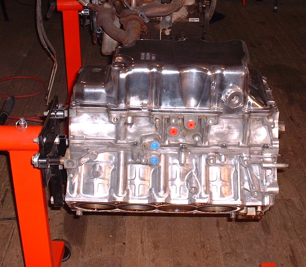 Then I broke out the polishing compound and my 8” bench-mounted buffer and had-at-it for another 3.5 hours. I found that the oil pan isn’t made of the highest quality aluminium and there are swirls of different colors here and there. But that’s OK because at 120 km/h only the bugs at road level will ever see it… just before they get sucked into the vortex left behind by my rear bumper. I find photographing polished aluminium always disappointing; it never looks anywhere near as nice as it does in real life. I loosely assembled the engine block back together so that I could work on it at a comfortable work height on the engine stand. This is what it looked like with the pan done and halfway through the block sanding process. All said and done, the oil pan took 15.5 hours while the block took 25... sure makes the winter pass by quickly, and if you're a thief, it's a good way to get rid of your fingerprints too.