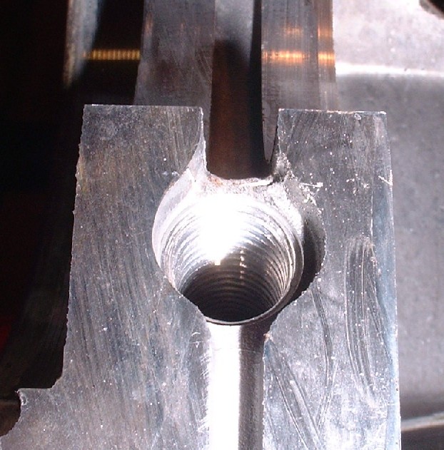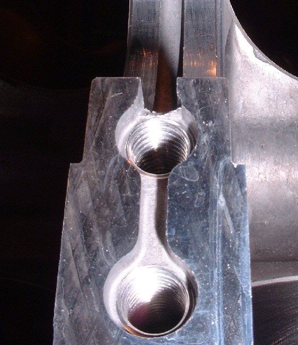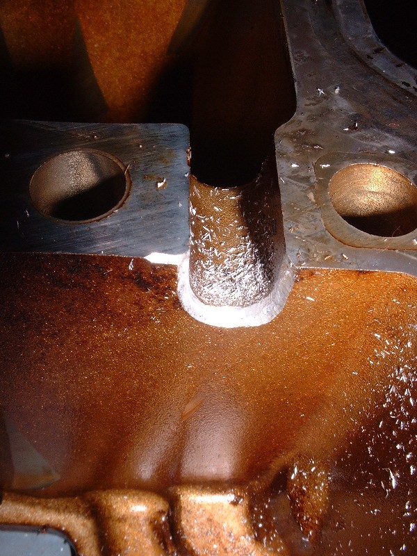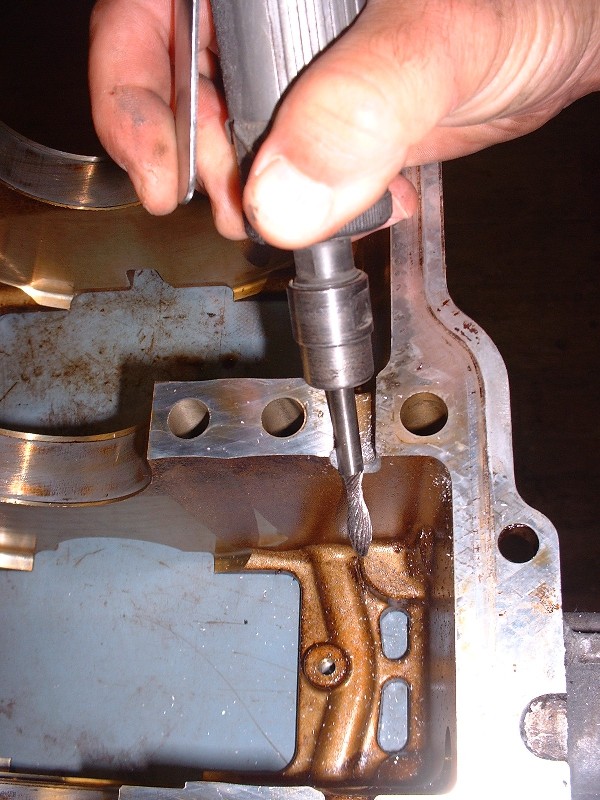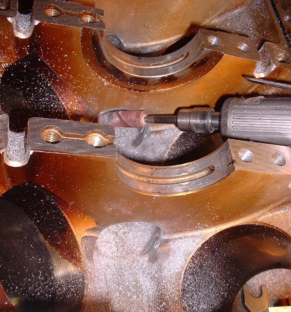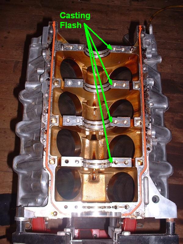 Lastly, in my search for any other little improvements, I found casting flash in all of the oil passages around the main bearing bolts. It wasn’t serious, but clearly an impediment to the oil flow up to the main bearings. Here’s a general picture to orient you with respect to where I found this problem.