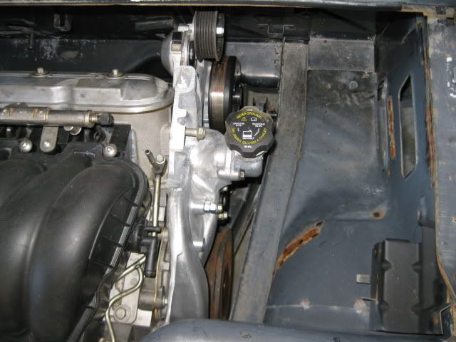 Here is the new thermostat housing and coolant fill location. The hose from this will easily clear the belt and the passenger frame rail.