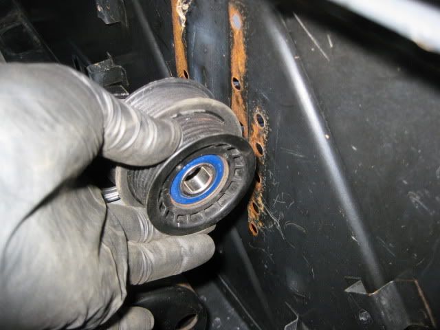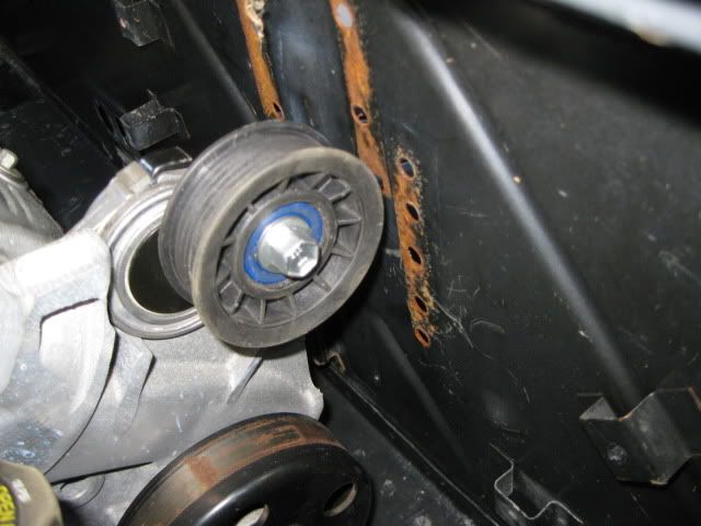 The tensioner pulley is about 5/8" from the firewall and only gets about 1/8" closer when the tensioner is pulled down. The vast majority of the engine movement will be to the rear, so this should be plenty of clearance. I could always swap out the pulley on the tensioner for the stock LS4 tensioner pulley that is about 1/2" smaller in diameter to gain some more clearance. Also, it is clear than the tensioner pulley will be into the passenger hinge box... it is good than my fiero will not need/have these boxes... mostly in an efffort to remove clutter from the engine bay.
