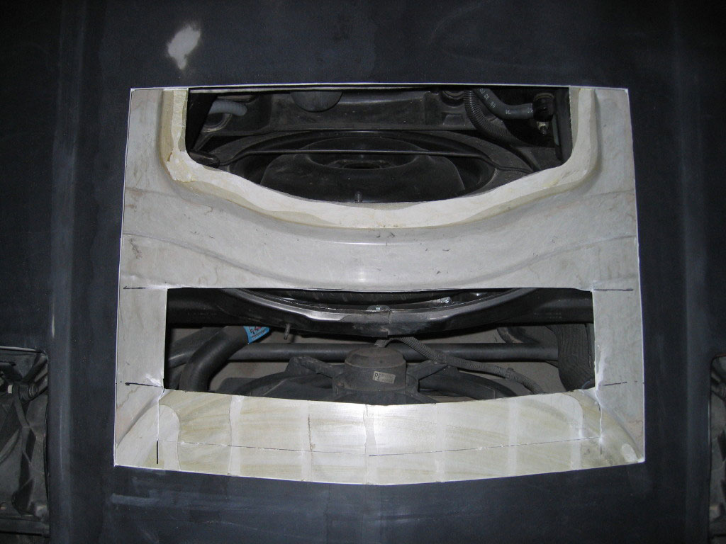 I put the pieces that I cut out back in for the first of these photos. I wanted to show how it looked before I screwed up... The first cut took out the part of the lower skin that would seal the spare tire area by mistake. I should have spent more time figuring out which part of the skin could be left in place. It would be a close fit but I think the vent would have fit with that part of the lower skin intact. The second cut was to remove more of the lower skin because it was visible through the vent from the top. If I had to do it over again I would make sure that I left all of the lower skin that touches the seal when the hood is closed. The version 2 vent does not need any sheet metal cut out. It also allows for putting the sun-roof glass in it's stock location over the spare tire.