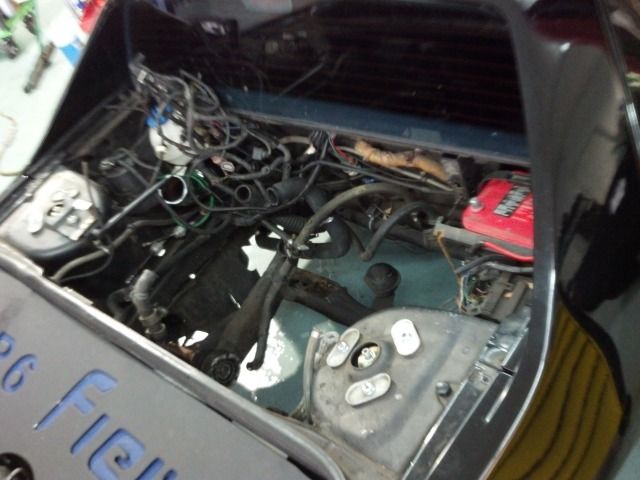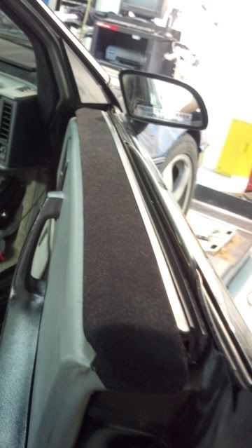 Dash was removed and the upper portion was flocked. Both A-pillars were flocked as well. The headliner was covered in suede. The B-pillars and floor trim were painted black. The rear covering on the rear firewall was covered in suede.