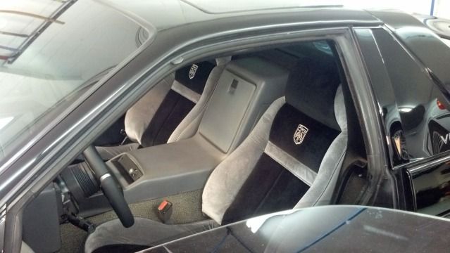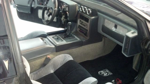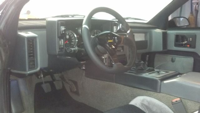 suede headliner, rear covering below window and lower portion of door panels flocked dashboard, rally gauge cover, upper portion of door panels, and A-pillars Speedhut gauges and updated climate control lighting (courtesy of Charlie64) shortened shifter with new shift knob and boot painted B pillars, floor trim and door arm rests Momo steering wheel All new interior swap wiring harness loyde's custom floor mats with Fiero logo Mr. Mike's full cloth seat covers (Joey absolutely hates non cloth seats, so we waited until Mr. Mike's made the full cloth GT style) New window tint 5% rear, 20% sides