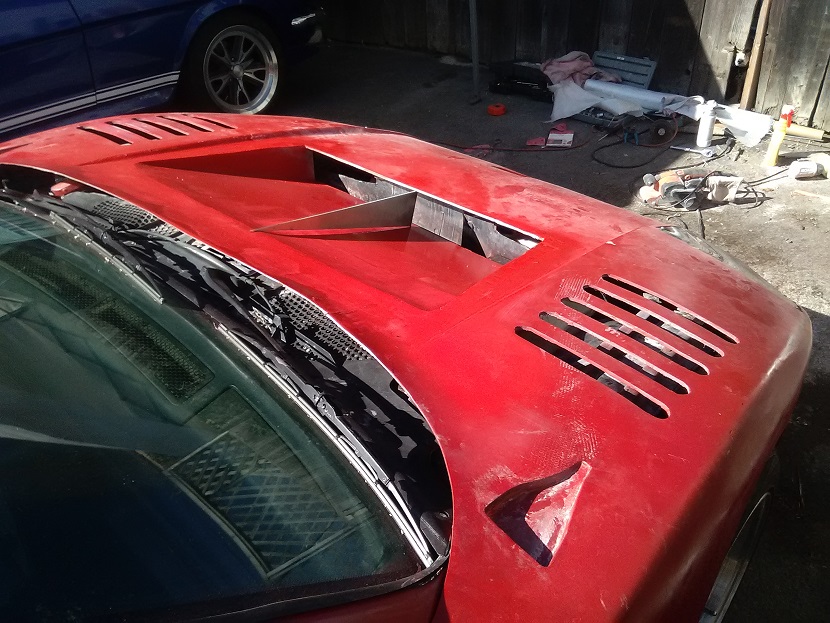 Made some more progress on the hood scoop. I cut the center piece today, have to do some shaping then weld on from the bottom. Been driving the car around a bit, very fun. Totally gutless in 3rd n 4th, brakes are not too strong on these cars. I got a wheel rub issue at full turn and a clunk started today from the front pass suspension.