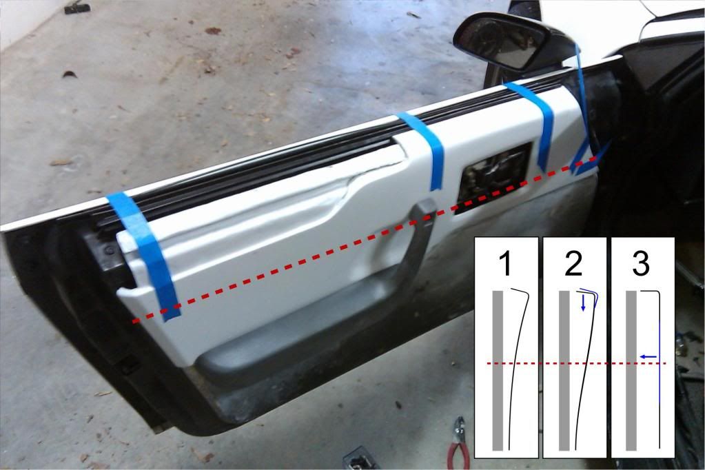 1) Shows how badly the panel warped - the red line represents where the top of the grab handle bolts to the door.