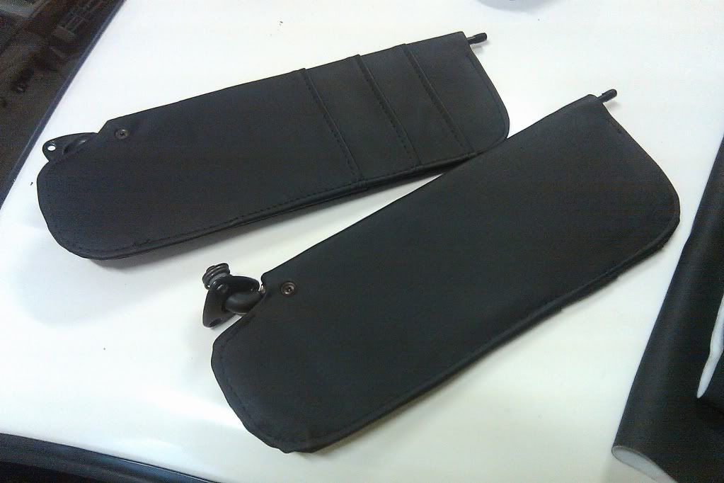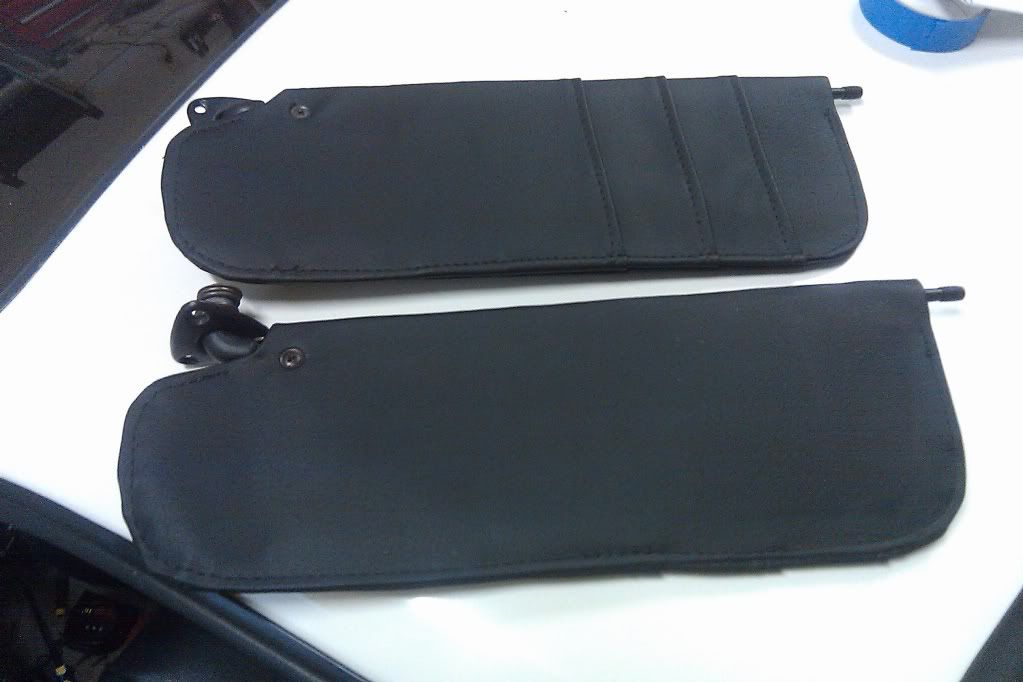 I completely forgot to post these pics of the newly upholstered sunvisors! I had 3 pockets stitched on each - you know me... you can have never enough places to store stuff! I think they turned out real sharp. The same shop will also upholster the door pulls.