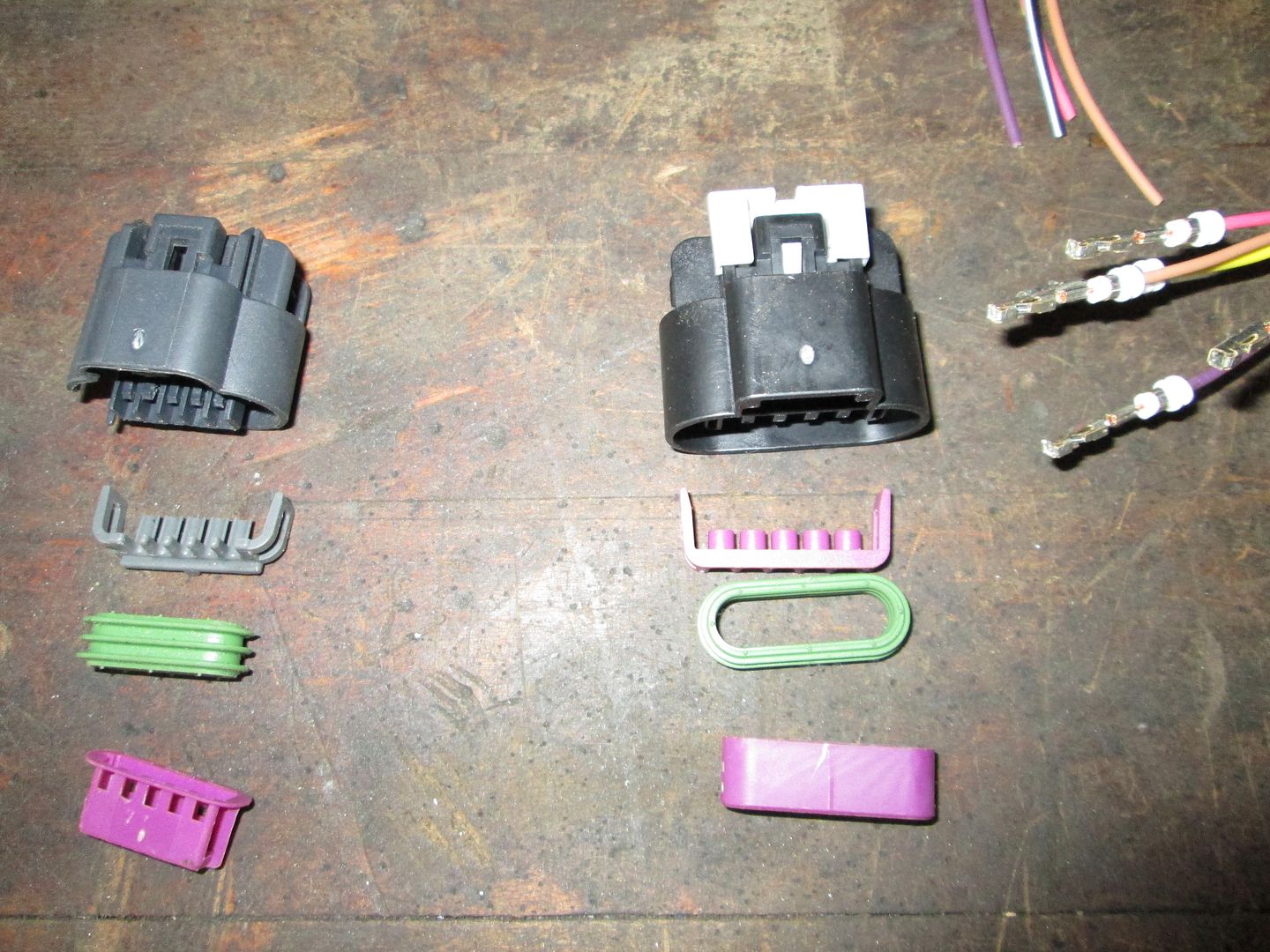 While letting the tube dry, it was time to swap out the connector end since they were different. The good news is it literally is just swapping out the connector end. Here are the two connector ends (LS2 on the left, LS7 on the right). Each one was opened up, the terminals released and pulled out of the housing: