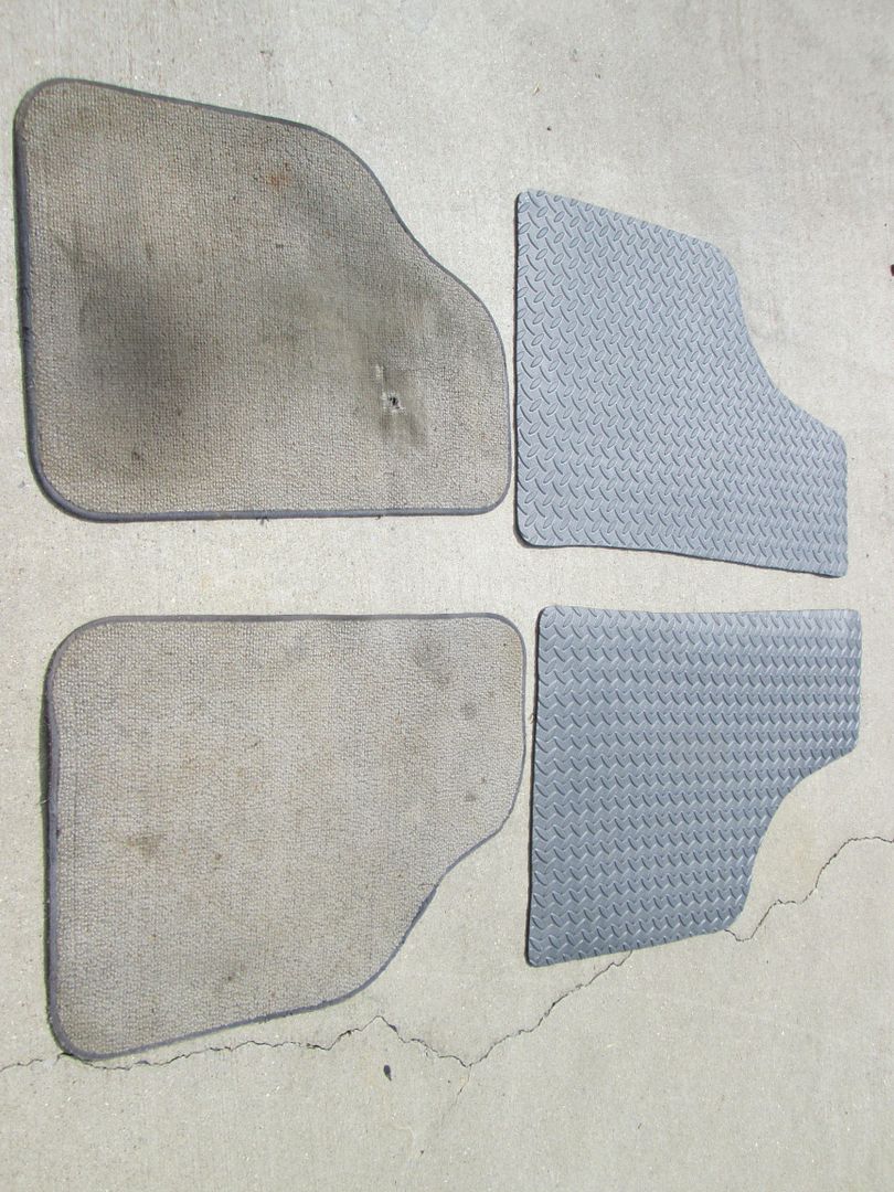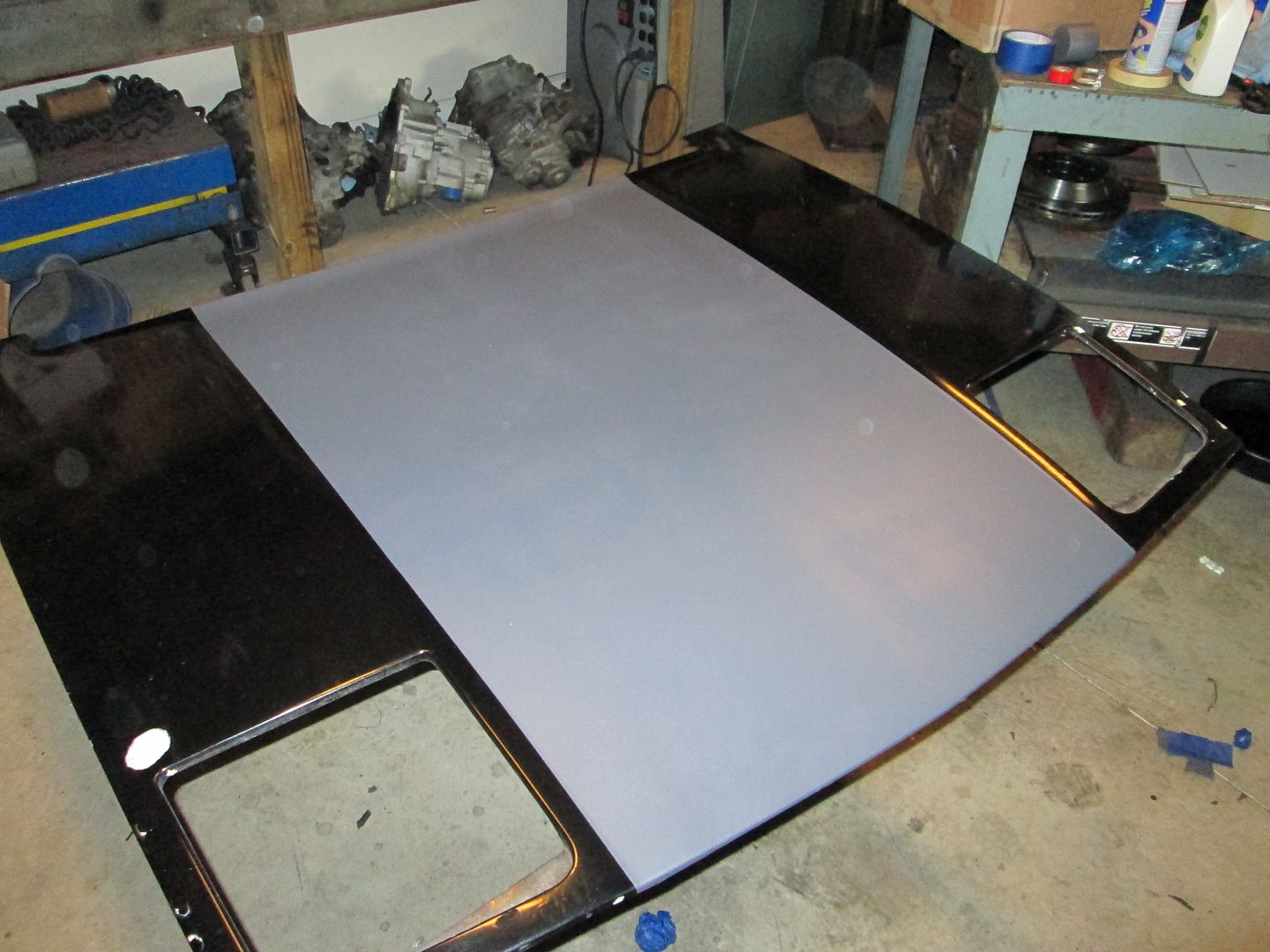 I have been busy swapping the roof panel (no more sunroof). When I started the roof panel swap, the carpet was wet from sitting outside during the rain, so I pulled all the carpet back out. I have the new top panel sanded down and ready to primer/paint before it is installed on the car.