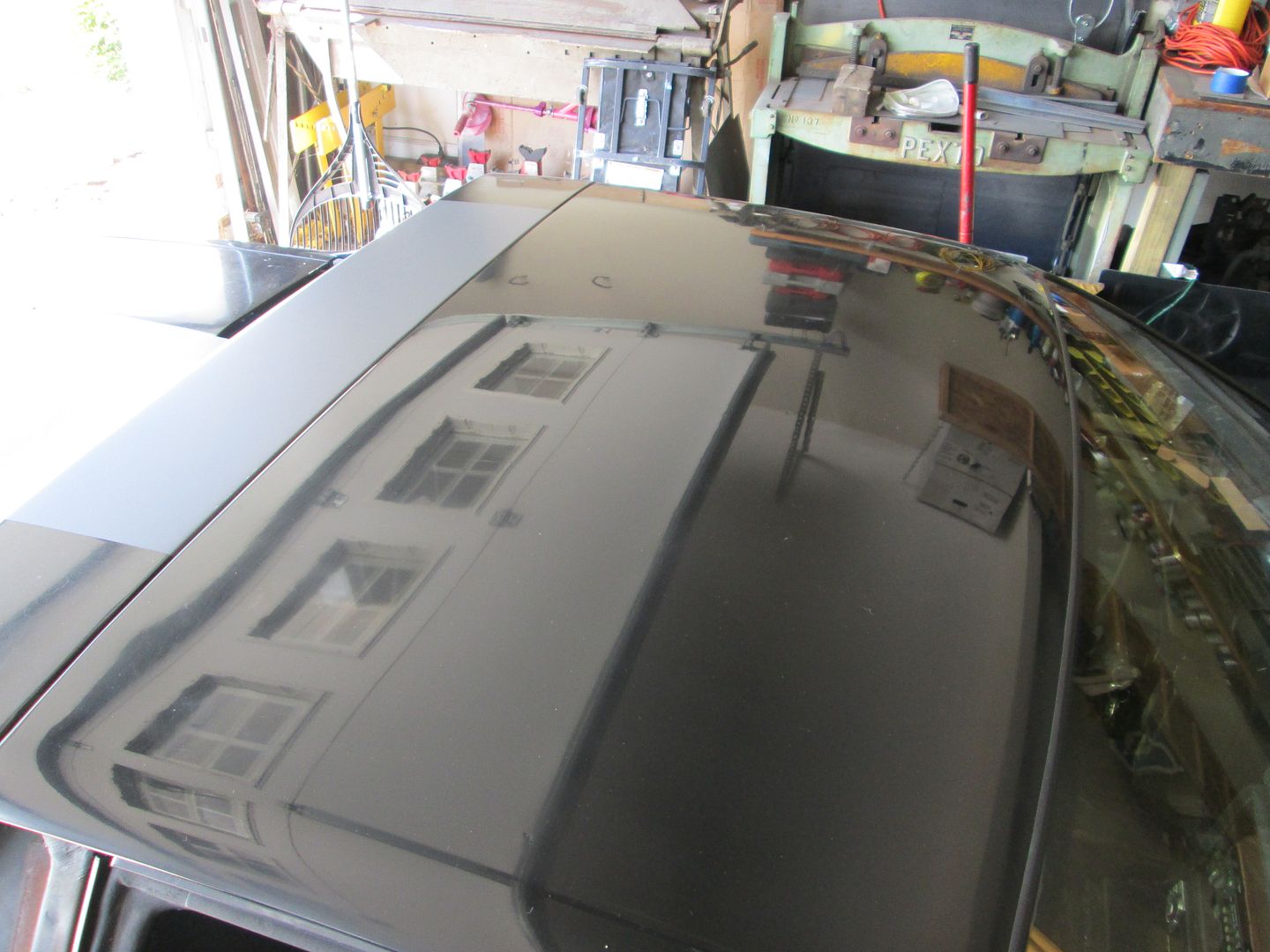 The roof panel swap is now complete. It came off a white car, so I wanted to get it painted black to atleast match the current paint on the car (I would like to get the whole car painted voodoo blue eventually, but black works for now). I really hate painting... this panel is far from perfect but it will work till I get the car painted professionally.