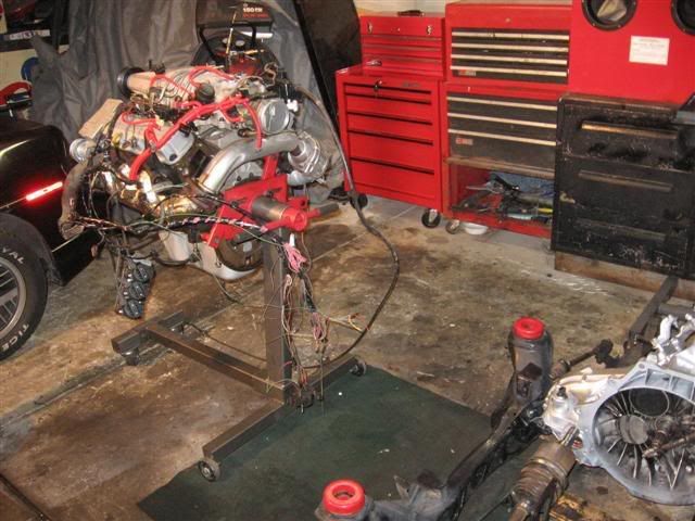 Took for ever to line up, but the tranny and engine are now together and on the cradle!!! Started lowering the engine onto the cradle with the tranny already mounted, but nothing would line up. After messing with it for awhile I took the tranny off the cradle and tried it with just the engine mounted. Picked the tranny up and it mated right up to the block lol.