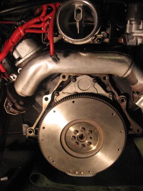 GOT MY CLUTCH IN TODAY!!! It was only a 2 week wait lol. So I got the engine off the stand tonight, and got the flywheel and clutch kit mounted. Also got the starter mounted, ended up using the one I had on my 2.8 because I only had it on the car for 40 miles. Put a order into summit today so hopfully I can get this thing running this weekend! Got the week off work so i'll be working on it everyday. Heres some pics Flywheel mounted