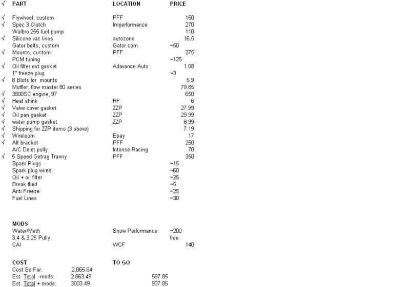 12-26-06 Ordered a Spec stage 3 clutch today, and yellowfiero88 delivered a getrag tranny too! Didn't get much work done on the swap today, just cleaned the tranny up, and mounted the oil filter ext along with a new gasket. As soon as I get my clutch in the tranny and engine is going onto the cradle. It's getting close to being done now! I have the week off work and school so hopfully I can get some work done on it. I always see post about how much a 3800SC swap cost, so I started a list at the start of my swap, it adds up pretty quick. Heres the list of parts: