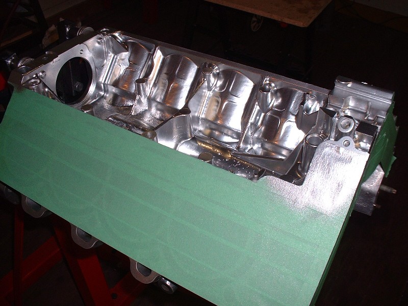 One thing I decided I wasn’t going to do was polish anything that wouldn’t be seen, like the intake valley (or the lifter valley if it were a pushrod engine). After the wash, the valley was super clean but still quite pitted so I wanted to protect it from future corrosion as much as possible. The dreaded white powder starts in the little pits and grows outward so the idea is to seal off the pits with paint to keep water and other contaminants out. Here's the bare valley: