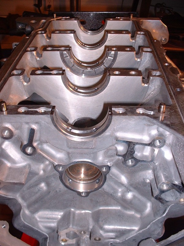 The lower bearing halves were installed in the lower case half, and the lower case half was then installed carefully onto the upper case half. There are four tight fitting guide pins that make installing the lower case half difficult without a rubber mallet.