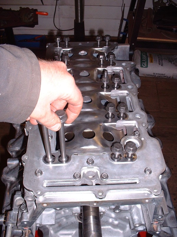And here’s the windage tray in position and the main bolts (all 20 of them) being set in place. Unlike the connecting rod cap bolts, these are not TTY (Torque To Yield) and can be reused.