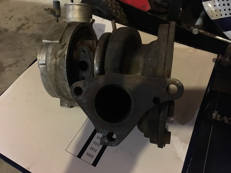 Some time over the winter I am going to swap my 20g turbo for the 16g I used to have on the car. I just think it is a better fit for the engine. It spools up faster and even at high speed in 5th gear it pulled hard. I bought the 20g as a package with the turbo manifold from Hahn racecraft and I should have bought the 16g version. And Hahn no longer makes the 16g version. So I need to make an adapter plate to make the old turbo work on the Hahn manifold. I do not even know if it will fit with an adapter plate on it but if it doesn't I will continue with the 20g.The old turbo with it's triangular turbine inlet: