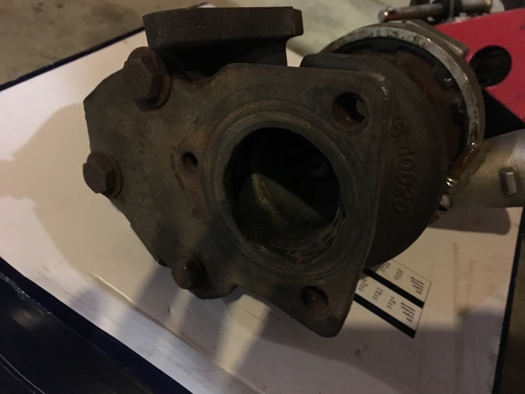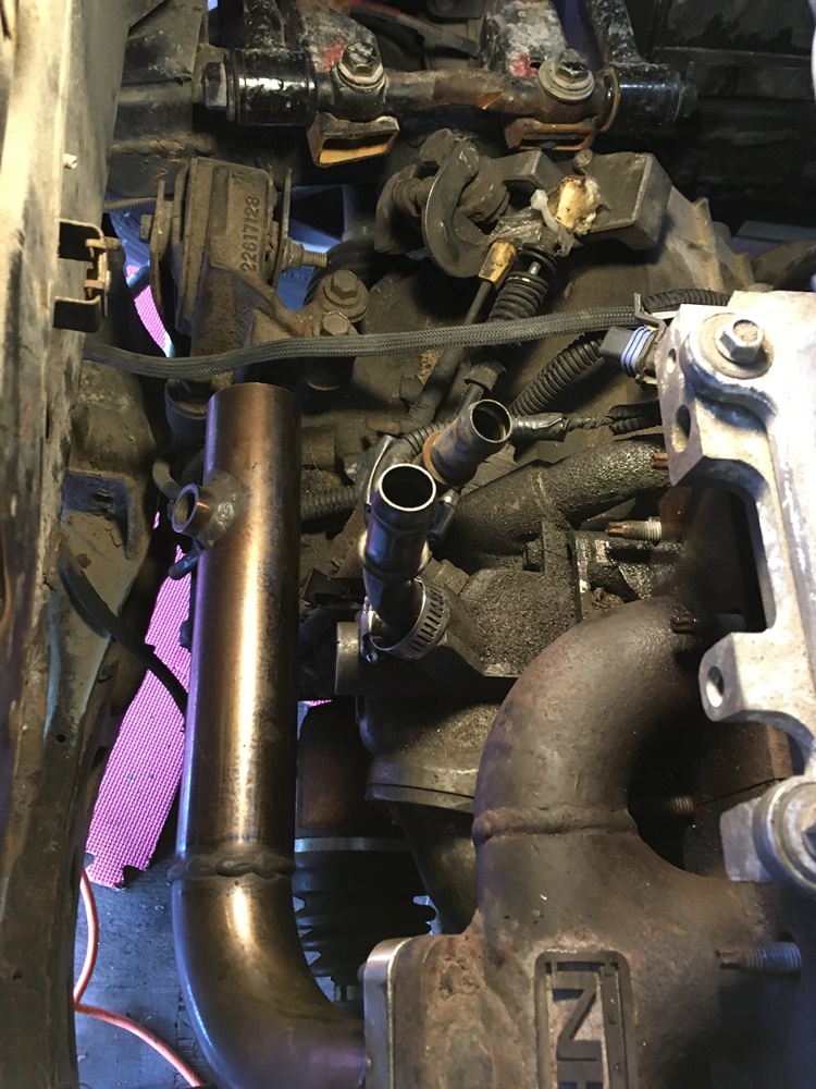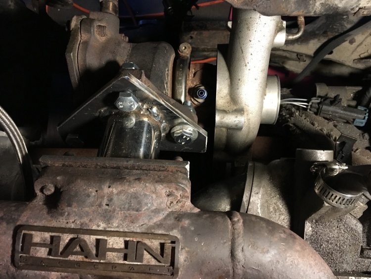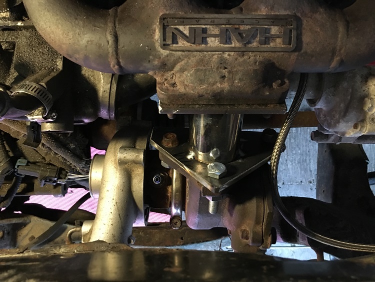 That almost worked, just needed the pipe cut on an angle to clear the axle and water pump plumbing. Finished turbo mount: