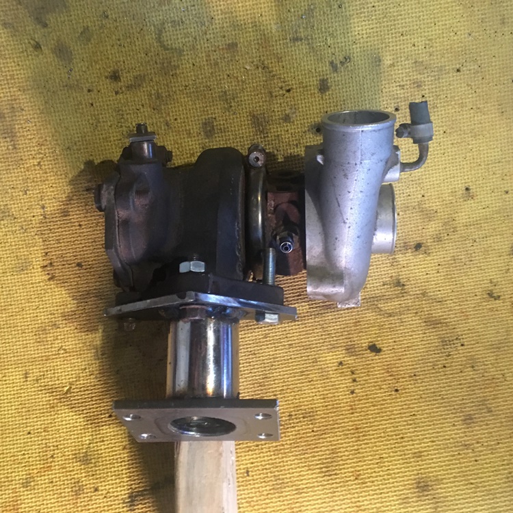 Call it the tube to no where, too low to connect to. While i was mulling over what to do about that, I held the turbo in the desired position and discovered that no matter which way I turned it, the hot side and the cold side outlets were pointing the wrong way. A new plan was needed and I figured some sort of short mount would work. Came up with this: