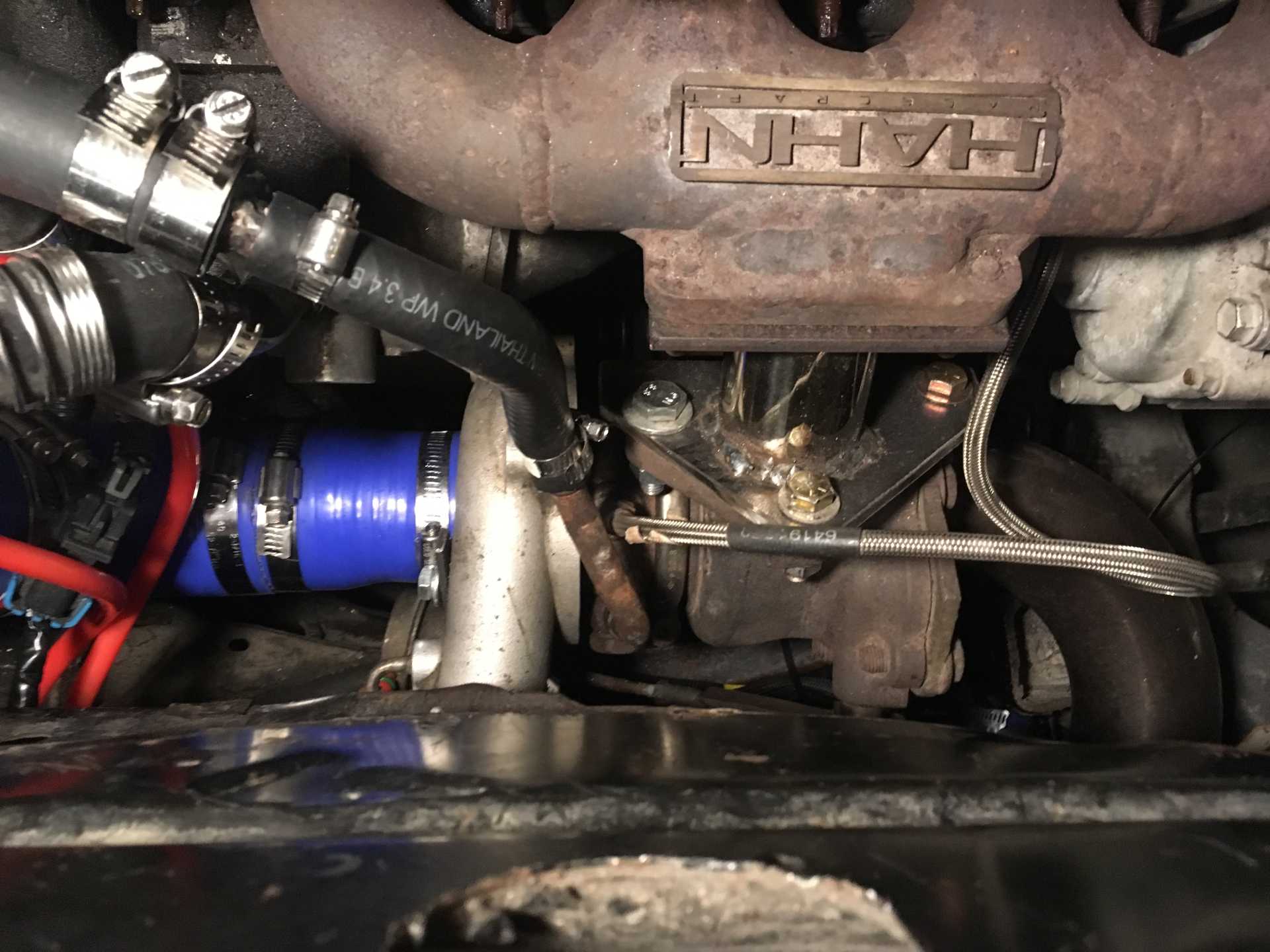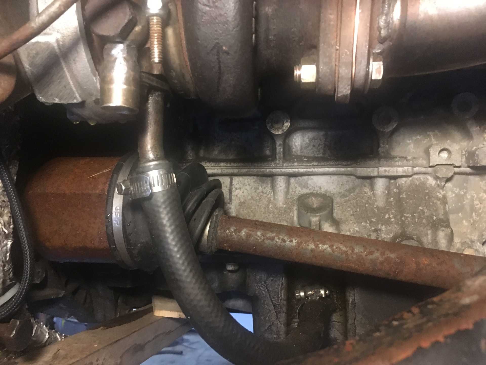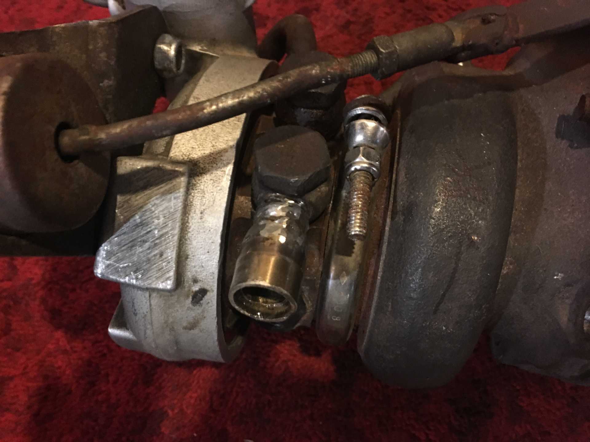 Turbo is ready for install now. Wastegate is on and setup and I welded up a pipe stub for one of the coolant feeds because the original tube was going in the wrong direction. Filled it up with hot water and did not see any leaks. No time tomorrow to work on it but on thursday I will bolt the turbo on and run the oil and coolant feeds and then put it up on the hoist and get the exhaust on.