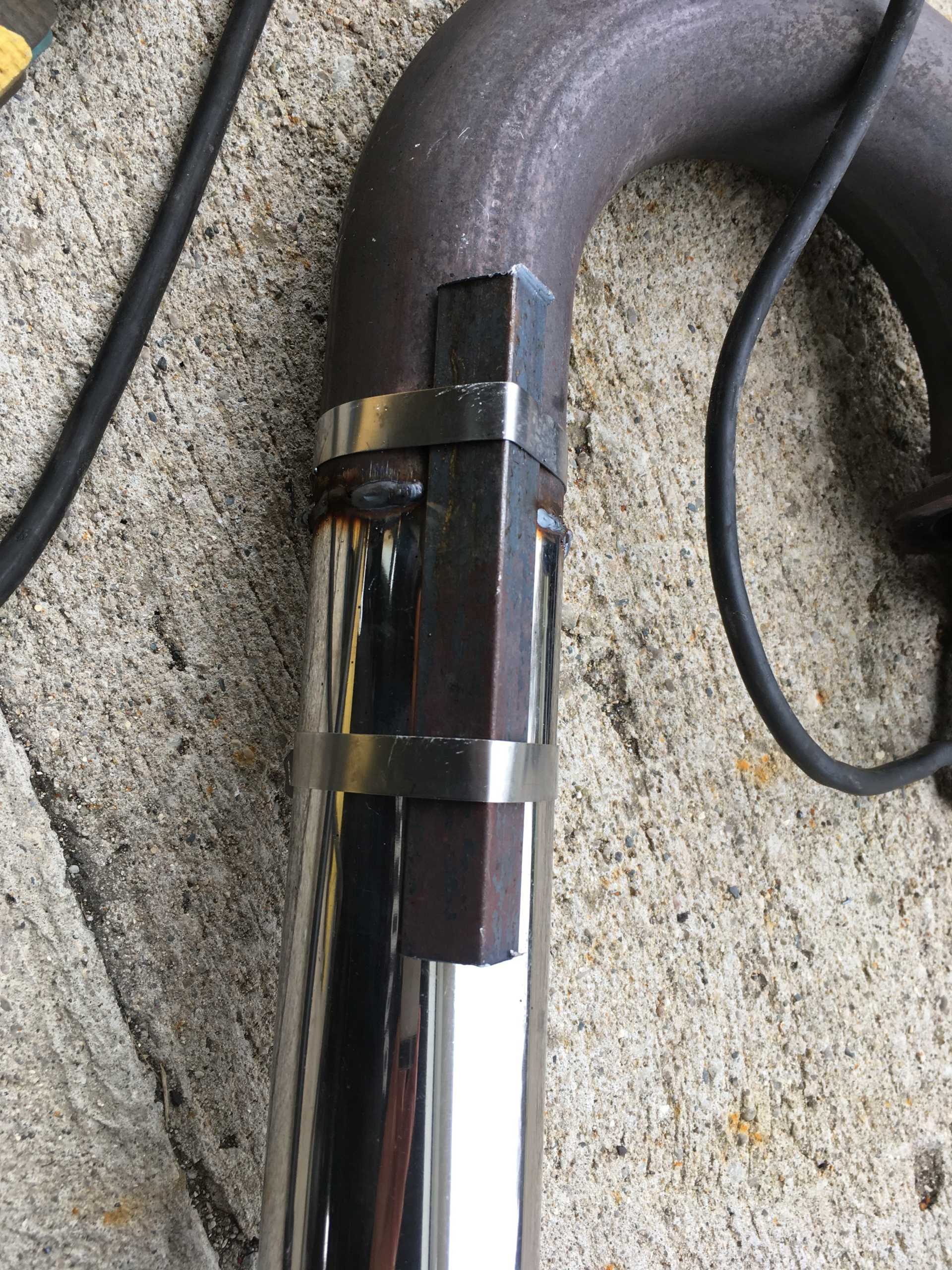 Working on the exhaust now. Progress is a little slower than I would like because although I can reuse almost everything from the old setup, I had to cut off two of the flanges, clock them and weld them back on to get the cat away from the charge piping and the bottom of the trunk. I figured out a new to me way to keep tubes straight for welding: