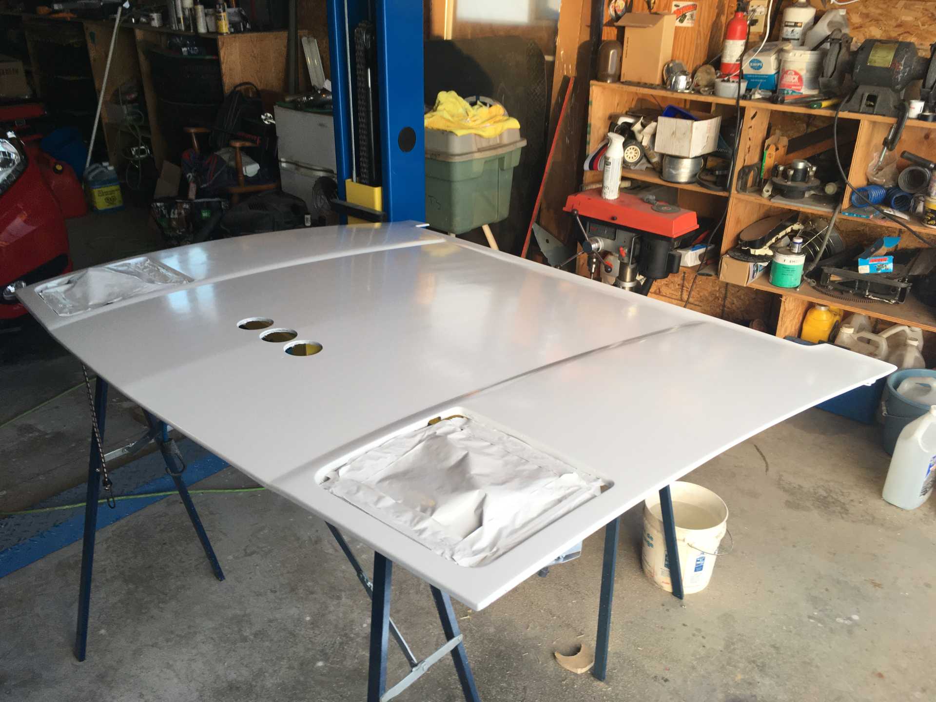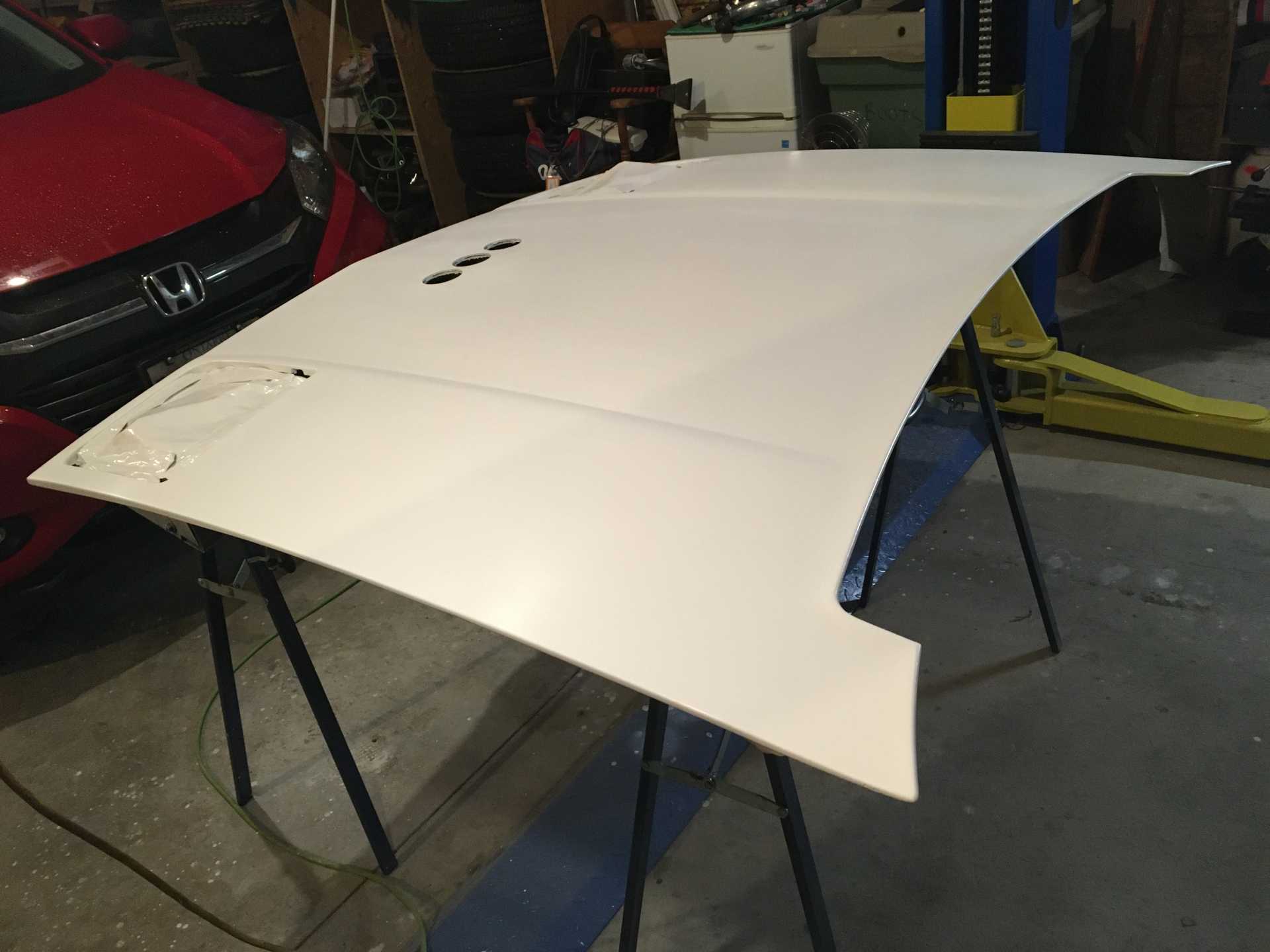 Slowly getting the hood painted. I took most of the old paint off, tried a different gloss white that didn't work out and took it back down to where it was . This was the second light coat of Rustoleum universal . I had to do two more coats and now it looks pretty good but I managed to get two small runs in it, up near the windshield wipers. The up turn makes the perfect place for runs to form. I am hoptng to be able to touch up the runs, I do not want to paint the hood again because it would mean sanding it down again. I have found the hood is the hardest part of the car to paint, with a rattle can anyway. All the other parts of the car(except the roof) can be painted in small chunks, making it much easier.