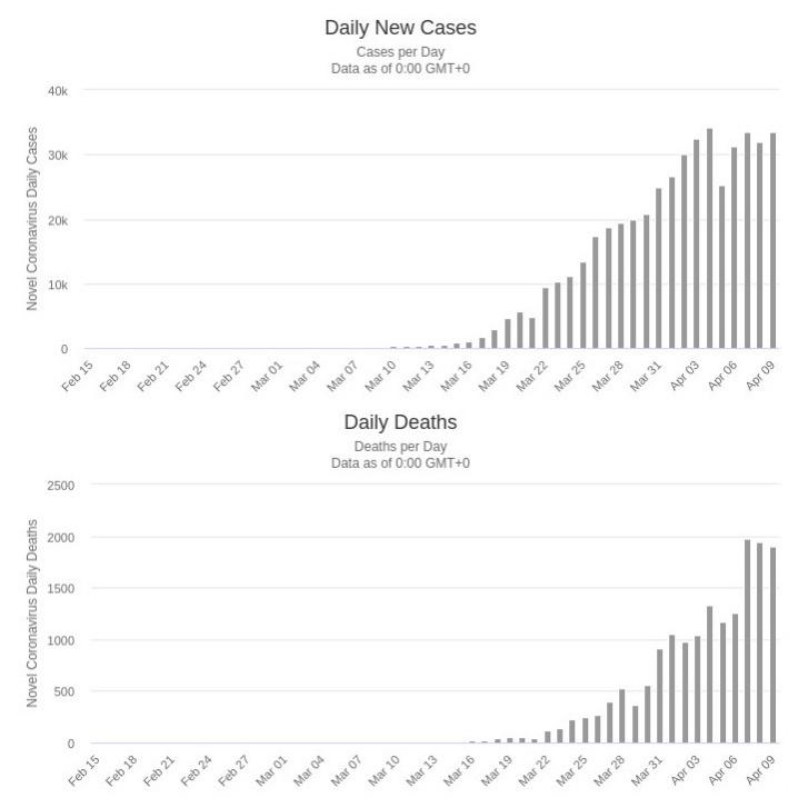 Yesterday Apr 9 data: USA Total=468,566 cases. New cases=33,536+. Total deaths=16,690. New Deaths=1,899. New York's New Deaths=799 So far today, Apr 10 with the daily reporting period about 1/2 over: USA Total=489,268 cases. New cases=20,702+. Total Deaths=18,015. New deaths= 1,325. New York's new Deaths= 777[This message has been edited by maryjane (edited 04-10-2020).]