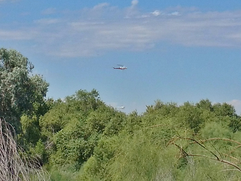 I watched a helicopter hovering over the river bottom, next to the airport. By the sound, I knew he was struggling. After a minute or two, he began to rise and I could see why. Suspended beneath him was a smaller helicopter. He picked it up and took it over to the airport and set it down. I didn't see any damage to the little one, but I was probably about a half mile away. I wonder if it was worked on by the same guy who worked on the little airplane a couple weeks ago