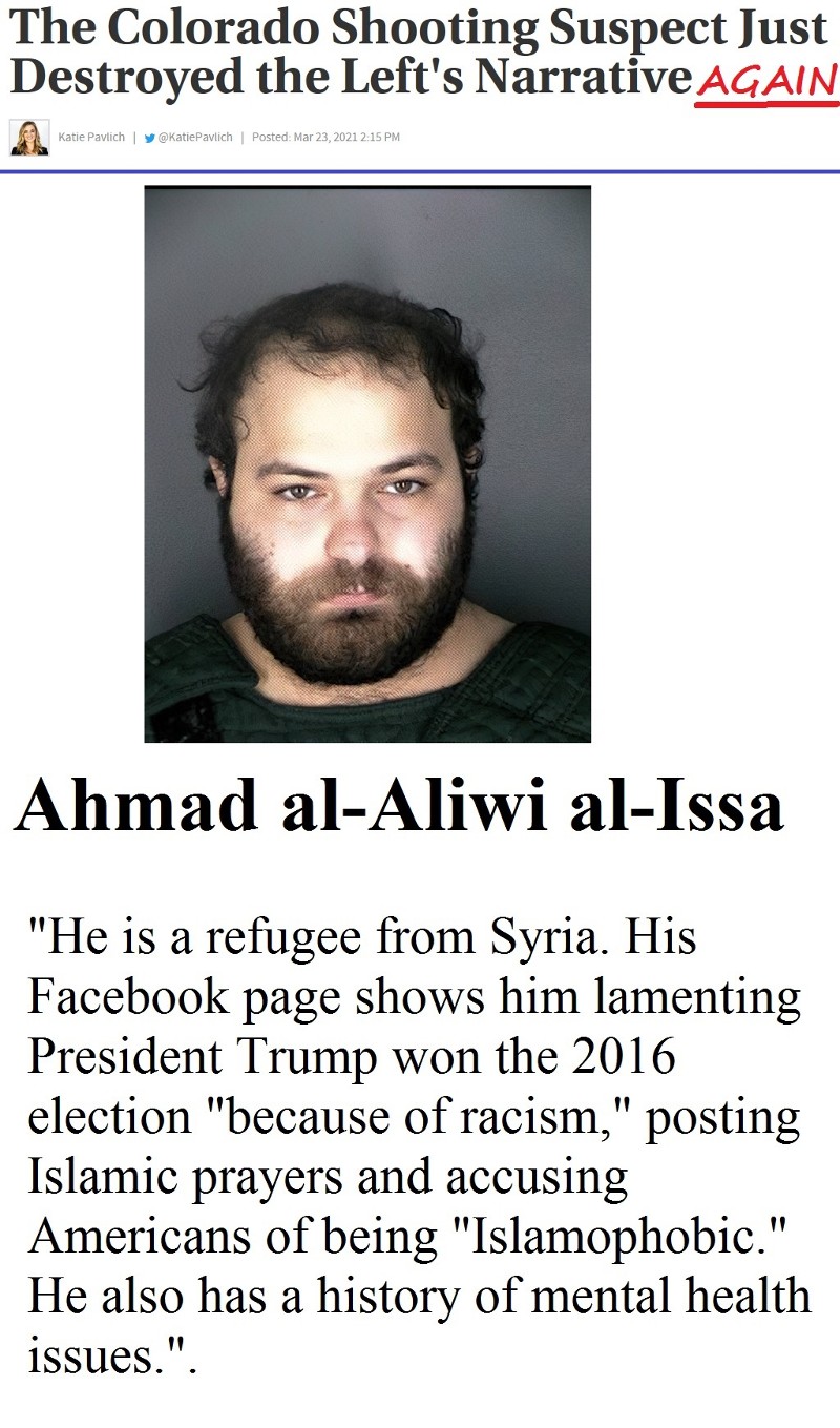 "The Colorado Shooting Suspect Just Destroyed the Left's Narrative" Katie Pavlich for Townhall; March 23, 2021 https://townhall.com/tipshe...s-narrative-n2586749