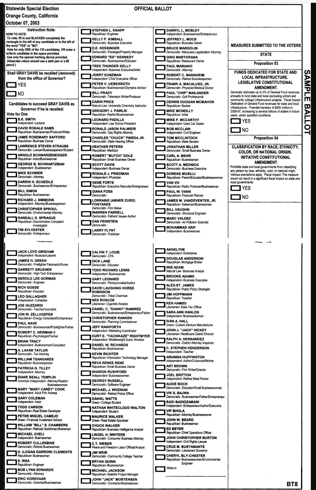 Hey, this is serious business going down. In 2003 we had 135 candidates running for Gov, including Larry Flynt for one. Just in case you are interested in some of the people running, check this out ...