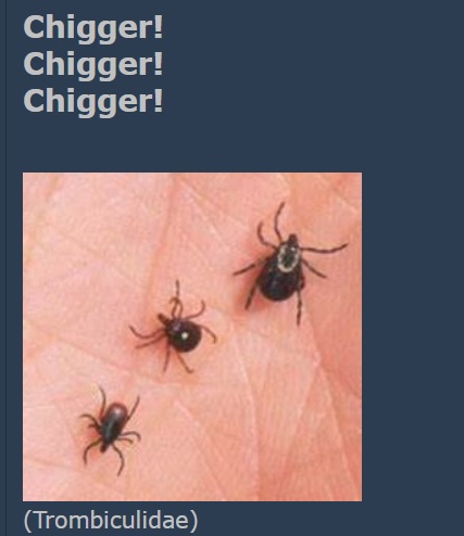 I'm not an entomologist.... or an etymologist....I just grabbed the first 3 bug image that popped up in a Bing search for: "chigger images"