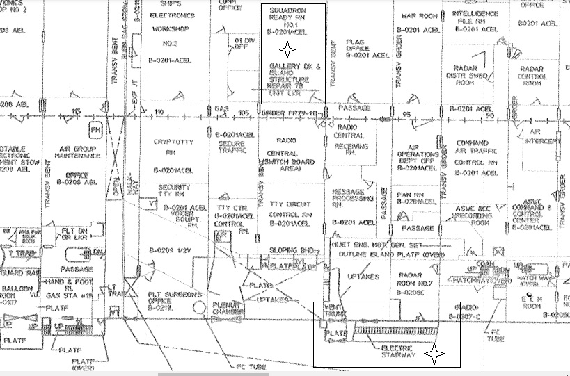 On my ship (USS Coral Sea) and all the super carriers, the ready rooms were in the deck between the flight deck and hanger. Earlier carriers had no deck between. And, I actually did not know that other carriers (Beyond Splash-down recovery-modified) had an escalator...I expect that one of the people I have told "Military carriers didn't have escalators" is going to come at me with a "You're wrong....what a dumb-azz!" (I hate when that happens)