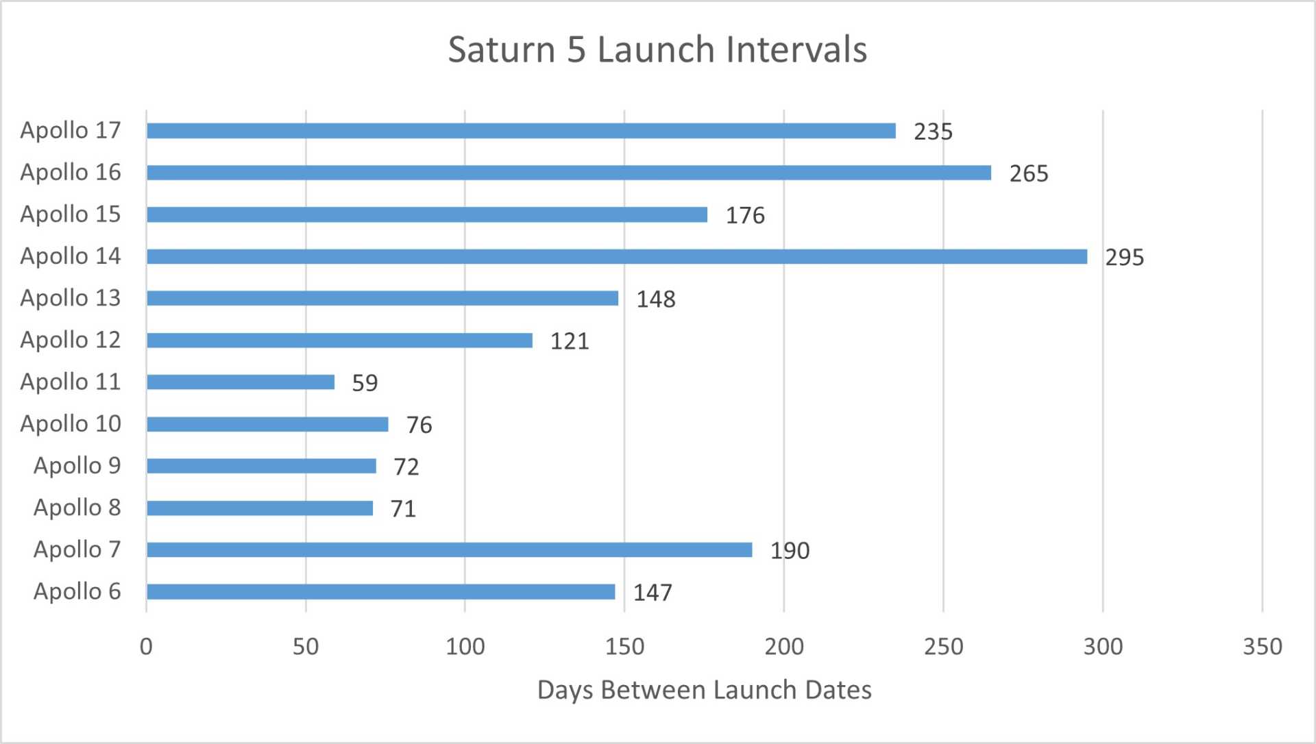 I was just looking for an Artemis schedule and am quite disappointed to see that launches are spaced out a year or more in between. A quick review of the Apollo program shows they were doing Saturn V launches on average every 155 days, with four consecutive missions launched in only 59 - 76 days. That's the NASA I remember.