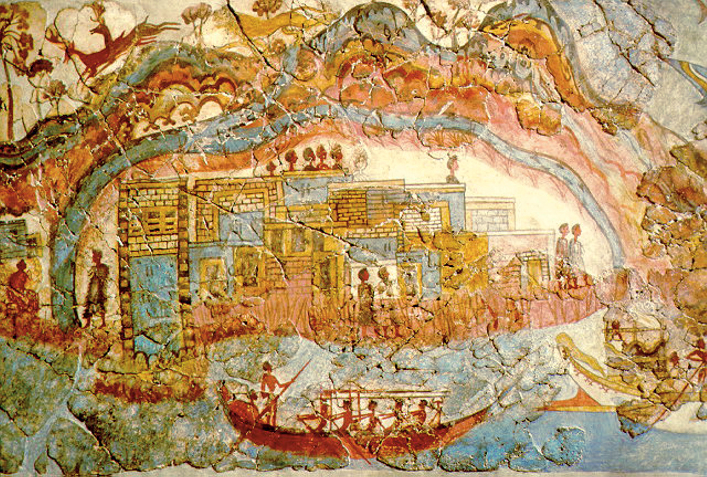 Top left, the stags hunted by a leopard, and why no one is depicted on the ridges above the town. Bottom left, the Pillars of Hercules. The size of the bulging uplift is relative to the surrounding sea, a town with multi storied buildings, a central street. Blown to bits when the volcano that it was, exploded violently in a VEI 7+ cataclysm, an order of magnitude larger than Krakatoa, massively displacing the Aegean, sending tsunamis and pumice to Crete, over washing the entire northern coastline. A large society ending event. The town's name was Atlantis, disappeared one day, under the sea.